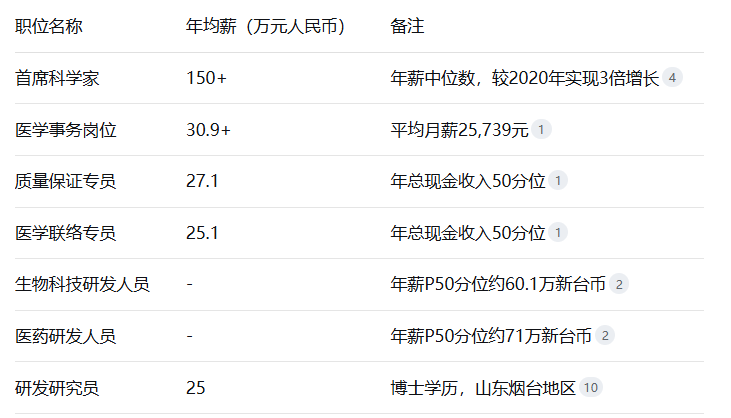 注意:以上薪酬数据通常包含基本工资、奖金、补贴等,但股权激励等可能未完全计入。某些高精尖岗位(如AI制药领域的复合型人才)由于其稀缺性,实际薪酬可能远高于市场平均水平。